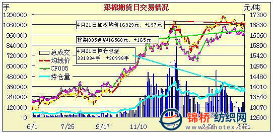 4月21日,鄭棉主要合約大幅高開,CF1009合約早盤在逢高平倉(cāng)盤的壓制下回落盤整,午后增量上行,交投重心上移,尾盤在短線產(chǎn)倉(cāng)盤的壓力下走低,日線形成高開陰線星,日內(nèi)成交量放大,持倉(cāng)量略增;CF1101合約高開調(diào)整后低位增量盤整,午后增倉(cāng)沖高,尾盤受近月回落的影響減倉(cāng)回落,日線形成陰線星,日內(nèi)成交量放大,持倉(cāng)大幅增加。CF1009合約日成交116004手,日增倉(cāng)3000手,終盤持倉(cāng)量146358手;CF1101合約日成交144300手,日增倉(cāng)25444手,終盤持倉(cāng)量111172手。基本面情況:現(xiàn)貨價(jià)格整體維持平穩(wěn),市場(chǎng)成交清淡,紡企仍是隨用隨買,采購(gòu)量不大。棉商出貨較前一段時(shí)間松動(dòng),只要價(jià)格差不多就能成交。據(jù)紡企反饋,湖北公檢三級(jí)棉今日提貨價(jià)在16600-16800元/噸。湖北宜昌、荊州等地區(qū)新棉開始種植,面積顯現(xiàn)增長(zhǎng)。河北、山東、河南由于氣溫偏低,仍繼續(xù)推遲種植。