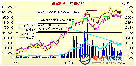 4月23日,鄭棉主要合約小幅高開,CF1009合約早盤在空頭回補的推動下沖高,隨后在平倉盤打壓下震蕩調整,日線形成陽線星,日內成交量萎縮,持倉量減少;CF1101合約在多頭買盤推動下上沖,午后小幅調整,日線形成陽線,日內成交量放大,持倉增加。CF1009合約日成交35522手,日增倉5738手,終盤持倉量131940手;CF1101合約日成交87292手,日增倉13474手,終盤持倉量124878手?;久媲闆r:印度棉限制出口漫延到國內棉花市場,棉商銷售轉緩,紡企采購高等級棉增多,價格小幅上調。別據(jù)紡企反饋,近日新疆棉動力加大,對內地市場形成有力補充。山東、河北、河南氣溫有所回升,棉花種植陸續(xù)展開。
