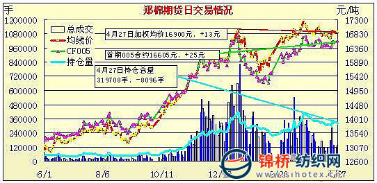 4月27日,鄭棉主要合約平開,CF1009合約早盤在平倉賣盤打壓下走低后在多頭集中買盤推動期價沖高,此后重心上移震蕩,尾盤在短線平倉盤的壓力下調(diào)整,日線形成高陽線星,日內(nèi)成交量略有放大,持倉量減少;CF1101早盤減倉震蕩,隨后在近月帶動下增倉上揚,午后重心上移窄幅盤整,日線形成陽線星,日內(nèi)成交量萎縮,持倉下降。CF1009合約日成交50914手,日減倉1340手,終盤持倉量128544手;CF1101合約日成交75232手,日減倉5496手,終盤持倉量118452手?;久媲闆r:現(xiàn)貨市場紡企可買資源較少,四級以上棉花價格繼續(xù)上漲,新疆棉三級提貨報價已到16800-17000元/噸,棉商更加看好6、7月行情。五一假期來臨,部分紡紗廠采購增多,市場成交較前期活躍。周末全國大部分地區(qū)氣溫升高,棉花播種基本展開,山西、陜西、安徽已見棉苗。