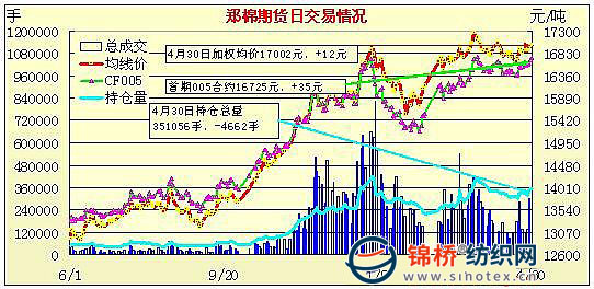 4月30日,鄭棉主要合約低開,CF1009合約在空頭回補(bǔ)與多頭買盤推動下震蕩上揚,午間多頭買盤再涌,帶動期價增倉上揚,午后重心上移震蕩,日線形成低開陽線,日內(nèi)成交量變化不大,持倉量小幅增加;CF1101早盤受到空頭回補(bǔ)推動回升,午后追隨近月上漲,日線形成低開陽線,日內(nèi)成交量較前一日下降,持倉繼續(xù)減少。CF1009合約日成交67092手,日增倉1700手,終盤持倉量135036手;CF1101合約日成交128936手,日增倉8338手,終盤持倉量139780手。 基本面情況:據(jù)反映,個別企業(yè)手中仍有好三級的棉花,但是出貨較少,計劃在五一之后出貨;紡織廠方面也要面臨五一小長假的問題,補(bǔ)庫意愿較強(qiáng),由于各棉區(qū)地產(chǎn)棉質(zhì)量存在差異,所以各地紡織廠在采購地產(chǎn)棉上面也表現(xiàn)不一,但對新疆棉的熱情依然較高。今明兩天隨著全國大范圍地區(qū)的天氣轉(zhuǎn)好好,各棉區(qū)的春播工作將進(jìn)一步擴(kuò)大,初步預(yù)計一些地區(qū)的植棉面積將成增加態(tài)勢。