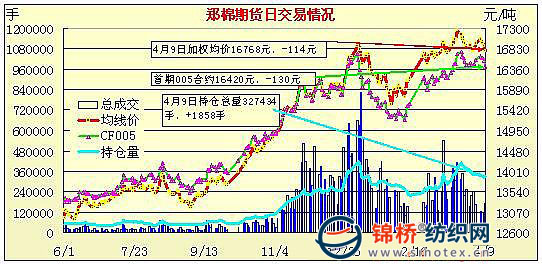 4月9日,鄭棉主要合約大幅低開,CF1009合約早盤下探后在多頭護盤的作用下反彈,盤中窄幅盤整,尾盤在周末空頭回補買盤的支撐下略收高,日線形成低開陽線星,日內成交量放大,持倉量略有增加。CF1009合約日成交137578手,日增倉5486手,終盤持倉量180820手;CF1101合約日成交20706手,日增倉80手,終盤持倉量71464手?;久媲闆r:現貨市場高等級棉報價繼續(xù)上調,尤其新疆棉到達內地銷售較好,三級成交價有的已到16900元/噸。四級及四級以下棉花價格較為平穩(wěn)。安徽地區(qū)不三不四棉花提貨價在16200-16300元/噸左右。下游紡織企業(yè)4月訂單有所減少,對成品銷售信心不強。山西、陜西、新疆棉花種植居前,已經基本展開,其他地區(qū)將在4月中下旬大面積展開。