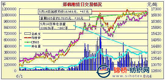 5月14日,鄭棉主要合約平開,CF1009合約早盤橫向盤整,隨后多頭買盤推動期價直線拉升,午后窄幅震蕩,日線形成陽線,日內(nèi)成交量變化不大,持倉量增加;CF1101早盤在空頭回補的支撐下反彈盤整,午間增倉上揚,午后在多頭平倉的打壓下回落盤整,日線形成陽線星,日內(nèi)成交量萎縮,持倉量下滑。CF1009合約日成交42808手,日增倉2270手,終盤持倉量125826手;CF1101合約日成交114360手,日減倉2492手,終盤持倉量146954手。基本面情況:近日各紡織企業(yè)棉花庫存面臨見底,不得不增加棉花采購。加上印度控制棉花出口對市場影響開始顯現(xiàn),棉花供不應(yīng)求現(xiàn)象不斷加強,致使國內(nèi)外電子盤也連續(xù)攀高,紡企采購越來越困難。國家已于上周簽發(fā)棉花進口配額文件,預(yù)計近期將下發(fā),總量80萬噸左右。另外,從鐵道部獲悉,自4月16日至7月24日開展100天新疆棉突運工作。烏魯木齊鐵路局要按照鐵道部關(guān)于棉花突運工作的有關(guān)要求,確保棉花日均裝車達到300車以上,力爭用100天時間完成新疆棉花的突運任務(wù);可見國家調(diào)控決心,預(yù)計后期棉花價格上漲將趨緩。