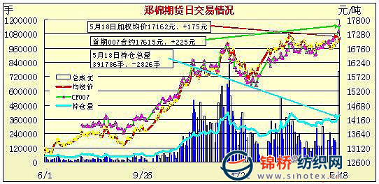 5月18日,鄭棉主要合約高開,早盤寬幅震蕩,重心回穩(wěn),CF1009合約午后在多頭買盤推動下走高,終盤收于日高點(diǎn)一線,日線形成長陽線,日內(nèi)成交量較前一日下降,持倉量增加。CF1101合約早盤沖高回落,盤中受到空頭回補(bǔ)的支撐區(qū)間震蕩,尾盤在多頭買盤支撐下收強(qiáng),日內(nèi)成交量萎縮,持倉量大幅減少。CF1009合約日成交132916手,日增倉5690手,終盤持倉量147406手;CF1101合約日成交361558手,日減倉9774手,終盤持倉量188308手?;久媲闆r:由于今年全國普遍氣溫較低,新棉上市預(yù)計將推遲。目前囤棉的企業(yè)已經(jīng)寥寥可數(shù),紡企采購范圍日漸縮小。紡企反饋,只要供應(yīng)商有貨紡企就會搶買,多是現(xiàn)款提貨,棉企出售也較為積極,新疆棉三級報到17500元/噸。