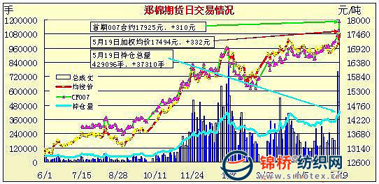 5月19日,鄭棉主要合約平開(kāi),CF1009合約在多頭買(mǎi)盤(pán)推動(dòng)下走高,午前窄幅盤(pán)整,午后多頭買(mǎi)盤(pán)再涌,推動(dòng)期價(jià)大幅上漲,尾盤(pán)在少量平倉(cāng)盤(pán)的打壓下調(diào)整,日線(xiàn)形成長(zhǎng)陽(yáng)線(xiàn),日內(nèi)成交量較前一日放大,持倉(cāng)量繼續(xù)增加。CF1101合約早盤(pán)調(diào)整后回升,午間追隨近月合約增倉(cāng)上漲,午后沖高,高位成交量放大,尾盤(pán)在平倉(cāng)盤(pán)打壓下小幅回落,日線(xiàn)形成陽(yáng)線(xiàn),日內(nèi)成交量變化不大,持倉(cāng)量增加。CF1009合約日成交255168手,日增倉(cāng)27998手,終盤(pán)持倉(cāng)量175404手;CF1101合約日成交361040手,日減倉(cāng)6558手,終盤(pán)持倉(cāng)量194866手?;久媲闆r:囤棉企業(yè)相繼調(diào)高了現(xiàn)貨報(bào)價(jià),三級(jí)棉價(jià)格沖擊18000元/噸,新疆站臺(tái)交貨三級(jí)17000元/噸,四級(jí)16500元/噸,公重,內(nèi)地三級(jí)提貨價(jià)17500元/噸左右。新疆棉花企業(yè)出貨積極,大部分企業(yè)銷(xiāo)售完畢。經(jīng)營(yíng)外棉的企業(yè)也反應(yīng)供不應(yīng)求,銷(xiāo)售火爆。另?yè)?jù)了解,部分中小紡企已經(jīng)拿到配額,多為幾百?lài)嵄阮A(yù)期的量少。并且外棉報(bào)價(jià)也較高,棉商惜售,紡企陷入茫然,為新棉上市前的補(bǔ)庫(kù)憂(yōu)愁。