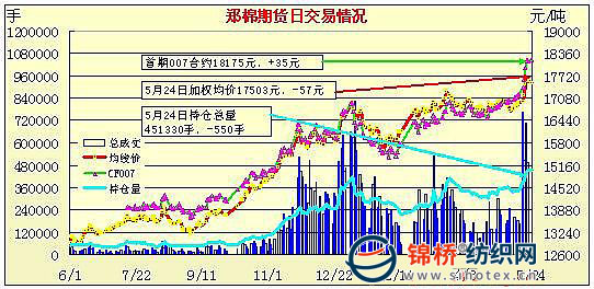 5月24日,鄭棉主要合約小幅高開(kāi),CF1009合約早盤增倉(cāng)大幅震蕩,隨后多頭平倉(cāng)打壓期價(jià)下行,午后在空頭回補(bǔ)支撐下盤整,日線形成高開(kāi)陰線,日內(nèi)成交量放大,持倉(cāng)量減少。CF1101合約早盤在空頭賣盤打壓下回落創(chuàng)日低,隨后在少量回補(bǔ)買盤支撐下反彈盤整,日線形成1/2下影線的陰線,日內(nèi)成交量放大,持倉(cāng)量增加。CF1009合約日成交294916手,日減倉(cāng)3548,終盤持倉(cāng)量198802手;CF1101合約日成交269060手,日增倉(cāng)2010手,終盤持倉(cāng)量189042手?;久媲闆r:國(guó)家發(fā)改委召集有關(guān)部門棉花宏觀調(diào)控聯(lián)席會(huì)議,分析當(dāng)前棉花形勢(shì),研究宏觀調(diào)控措施。上周發(fā)出消息,為滿足紡織企業(yè)需要,有關(guān)部門在積極協(xié)調(diào)新疆棉運(yùn)輸?shù)耐瑫r(shí), 5月份增發(fā)了80萬(wàn)噸滑準(zhǔn)稅配額,下一步,將根據(jù)市場(chǎng)變化和紡織需求形勢(shì),研究繼續(xù)增發(fā)進(jìn)口配額,同時(shí)不排除采取其他調(diào)控手段穩(wěn)定市場(chǎng)。此消息提醒企業(yè)不要茫目追高,防止風(fēng)險(xiǎn),也表明了棉價(jià)過(guò)高國(guó)家將繼續(xù)增強(qiáng)調(diào)控措施,滿足紡企用棉需求。現(xiàn)貨市場(chǎng)暫無(wú)明顯影響,價(jià)格繼續(xù)上漲,但紡企采購(gòu)放緩,觀望居多。