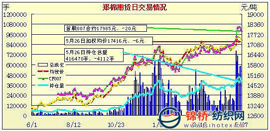 5月27日,鄭棉CF1009合約小幅低開,早盤在震蕩上行,午后在多頭平倉的打壓下重挫,日線形成陰線,日內(nèi)成交量萎縮,持倉量大幅減少。CF1101合約早盤反復(fù)震蕩,午后一度在空頭回補(bǔ)支撐下沖高,但是受到平倉盤壓制,尾盤多頭平倉盤打壓期價(jià)收弱,日線形成長上影線的陽線星,日內(nèi)成交量萎縮,持倉量減少。CF1009合約日成交150066手,日減倉17682手,終盤持倉量157916手;CF1101合約日成交164690手,日減倉2952手,終盤持倉量174608手。 基本面情況:目前保稅區(qū)棉花較多,用滑準(zhǔn)稅棉花配額購買進(jìn)口棉,提貨價(jià)在17000元/噸左右,相比新疆棉及內(nèi)地棉價(jià)格占有較大優(yōu)勢。另外,連續(xù)兩日電子盤的大跌,使紡織企業(yè)購買較為猶豫,打算進(jìn)一步觀望。因此,近兩日國內(nèi)棉銷售放緩,價(jià)格整體維持平穩(wěn)。棉花生長方面,冀魯豫維持干旱氣候,棉苗生長良好,湖南、湖北進(jìn)入棉苗移栽階段。新疆、甘肅多大風(fēng)天氣,對棉苗不利。