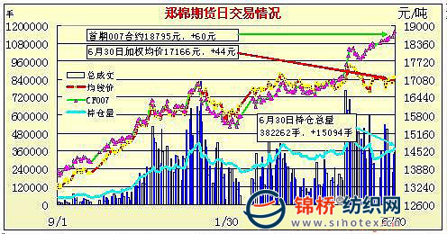 6月30日,鄭棉CF1009合約早盤小幅低開,盤中在多頭買盤推動下上行,盤中高位盤整,尾盤增量上行收于日高,日線形成陽線,日內(nèi)成交量放大,持倉量大幅增加。鄭棉CF1101合約低開,早盤大幅震蕩,隨后多頭買盤推動期價回升,午間增量沖高,午后在短線平倉盤的壓制下調(diào)整,尾盤增量收高,日線形成陽線,日內(nèi)成交量變化不大,持倉量增加。CF1009合約日成交79134手,日增倉10516手,終盤持倉量118828手;CF1101合約日成交246958手,日增倉1074手,終盤持倉量194938手?;久媲闆r:現(xiàn)貨成交繼續(xù)冷清,棉商報價居高,市場資源稀缺,紡企大多不急于用棉,保持觀望,只待國家拋儲。各產(chǎn)棉區(qū)天氣較適宜新棉生長,大部分地區(qū)新棉已經(jīng)出現(xiàn)開花,病蟲害整體輕于往年。