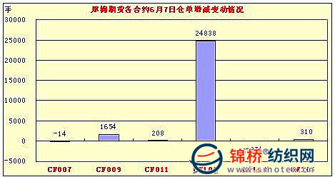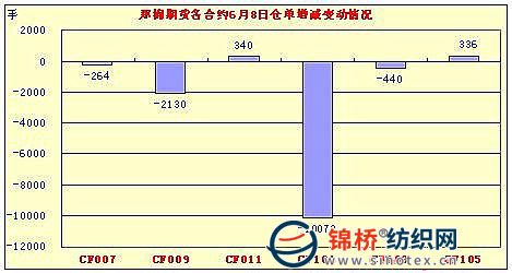 在昨日下調大幅減倉之后,6月8日,鄭棉全線高開,CF1009合約在空頭回補支撐下回升,盤中高位震蕩,日線形陽線,日內成交量萎縮,持倉量下降。CF1101合約高開震蕩,午后在空頭回補支撐下回升盤整,終盤收于日高,日線形成陽線,日內成交量萎縮,持倉量大幅減少。CF1009合約日成交110756手,日減倉2130手,終盤持倉量138472手;CF1101合約日成交192058手,日減倉10072手,終盤持倉量196916手?;久媲闆r:現(xiàn)貨價格繼續(xù)表現(xiàn)堅挺,但受市場上傳言國家可能繼續(xù)出調控政策及近期的外盤連續(xù)大跌影響,棉價走勢趨穩(wěn),紡企觀望情緒遞增。另據(jù)大部分紡企反饋,上月初拿到的進口棉花配額近日已經(jīng)基本用完,等待國家新的調控政策出臺。