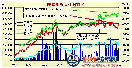 7月20日,鄭棉CF1009合約小幅低開,早盤調(diào)整后在多頭低位承接買盤支撐下回升震蕩,午后一度下滑,尾盤空頭回補令期價反彈,日線形成陽線星,日內(nèi)成交量略減,持倉量增加。鄭棉CF1101合約低開后在多頭平倉打壓下調(diào)整,盤中低位換后回升走高,午后放量下探,尾盤在短線回補支撐下反彈,日線形成陰線星,日內(nèi)成交量溫萎縮,持倉量減少。CF1009合約日成交74972手,日增倉5346手,終盤持倉量113314手;CF1101合約日成交176216手,日減倉5890手,終盤持倉量176216手。基本面情況:雖然上周棉價出現(xiàn)連續(xù)下跌,但拋儲遲遲未出,日前大棉商報價又有所抬高。小棉商報價則搖擺不定,是否該出貨較為猶豫。湖南、湖北、安徽、河南等地持續(xù)降雨出現(xiàn)內(nèi)澇,新棉開花、坐鈴受到一定影響。