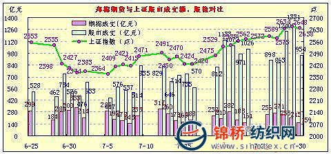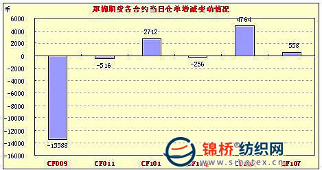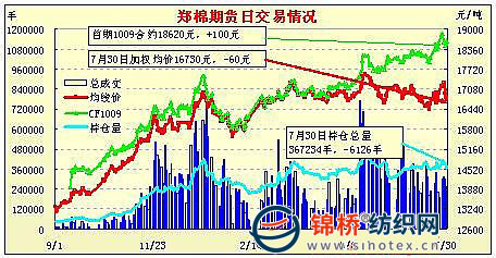 7月30日,鄭棉CF1009合約高開,盤中在空頭回補的支撐下回穩(wěn),午后上行,日線形成陽線,日內(nèi)成交量萎縮,持倉量大幅減少。鄭棉CF1101合約小幅高開,早盤震蕩整理,午后多頭買盤與空頭回補的支撐下走強,日線形成陽線,日內(nèi)成交量萎縮,持倉量略有增加。CF1009合約日成交20680手,日減倉13388手,終盤持倉量60744手;CF1101合約日成交131912手,日增倉2712手,終盤持倉量198482手。基本面情況:今日股市期貨資金出逃成交萎縮,股指小幅回落,期棉中幅收陽。上證股指收于2637.50點,跌10.62點,跌幅0.4%;成交954.01億元,減少376.51億元,降幅28.3%。鄭棉期貨成交19.01萬手,續(xù)減6.57萬手,下降25.7%;成交額159.05億元,減少55.75億元,下降26%。受政策性壓力預(yù)期增加影響,紡企都開始拭目以待拋儲出臺,幾乎停止采購。棉商小幅調(diào)低銷售報價,但成交寥寥無幾,并且下游紗線銷售不景氣,每噸掉價達兩三千元左右,部分庫存較大的紡織廠也開始銷售棉花,降低庫存。