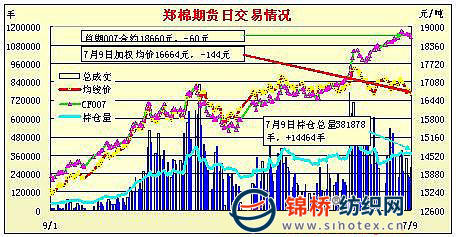 7月9日,鄭棉CF1009合約低開,早盤反抽回落后在空頭回補的支撐下脫離低點盤整,日線形成低開星線,日內(nèi)成交量放大,持倉量減少。鄭棉CF1101合約低開后在空頭賣盤打壓下回落,盤中低位增量盤整,午后因股市上漲帶動空頭回補推動期價回升,尾盤在空頭增倉壓制下收弱,日線形成低開陰線,日內(nèi)成交量放大,持倉量大幅增加。CF1009合約日成交35860手,日減倉2264手,終盤持倉量102394手;CF1101合約日成交219486手,日減倉14690手,終盤持倉量203982手?;久媲闆r:現(xiàn)貨報價基本維穩(wěn),成交極少。紡企反饋,日前大部分企業(yè)已拿到第三批進(jìn)口棉配額,但外棉可購買量也已不多,紡企利用率較低。拋儲遲遲未出臺,紡織企業(yè)有些及不可待,較猶豫是否近期使用配額購?fù)饷扪a充庫存。由于賣方貨源少,買方進(jìn)貨也少,價格又居高,導(dǎo)致購銷雙方難成交。