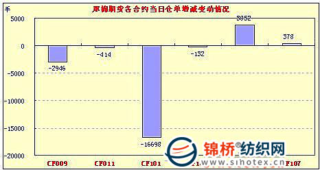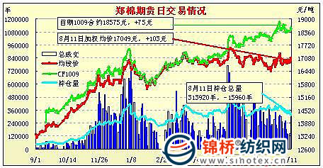 8月11日,鄭棉CF1101合約高開,早盤沖高后在多頭集中平倉盤的打壓下回落盤跌,尾盤弱市整理,日線形成長上影線的陰線,日內(nèi)成交量萎縮,持倉量大幅減少。CF1009合約日成交3106手,日減倉2938手,終盤持倉量18224手;CF1101合約日成交144322手,日減倉16698手,終盤持倉量169568手。基本面情況:昨日是國家儲備棉投放市場首日,紡織企業(yè)參與積極,競拍熱情較高,報價激烈。參與其中的多為急切用棉的紡企,想先采購一些補庫,維持生產(chǎn)。大部分企業(yè)仍維持觀望,等待市場進一步明朗?,F(xiàn)貨價格繼續(xù)下滑,市場成交更加冷清。