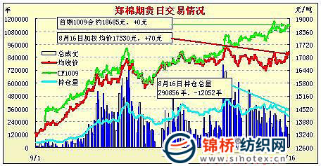 8月16日,鄭棉低開震蕩,成交萎縮,大幅平倉。當(dāng)日成交11.53萬手,減少7.42萬手;成交金額減至百億元以下為99.69億元,減少63.96億元,減幅40.1%。CF1101合約小幅高開,盤中反復(fù)震蕩,尾盤沖高上試,但是受到逢高平倉盤打壓回落,日線陽線星,日內(nèi)成交量萎縮,持倉量下降。CF1101合約日成交75882手,日減倉5922手,終盤持倉量150384手;CF1105合約日成交31966手,日減倉2424手,終盤持倉量91180手。 基本面情況:現(xiàn)貨成交繼續(xù)冷清,棉商出貨積極,紡企關(guān)注儲備棉競拍。從今日競拍情況來看,企業(yè)積極性有所減弱,加價緩慢。大部分企業(yè)對后市存在分岐,當(dāng)前多維持觀望。新棉生長較為樂觀,近日大部分棉區(qū)維持晴朗高溫天氣,有利于開花、坐桃。