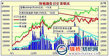 8月23日,鄭棉CF1101合約小幅高開,早盤在多頭買盤推動(dòng)下回穩(wěn)盤整直至收盤,,日線形成小陽線,日內(nèi)成交量萎縮,持倉量下降。CF1101合約日成交63812手,日減倉1254手,終盤持倉量154694手;CF1105合約日成交26280手,日增倉798手,終盤持倉量79624手。基本面情況:企業(yè)對(duì)后市看跌心理增強(qiáng)。囤棉企業(yè)出貨急切,唯恐后市價(jià)格再降。但紡織企業(yè)仍主要從儲(chǔ)備棉競拍上進(jìn)貨,現(xiàn)貨只有零星成交。近日冀魯降雨對(duì)棉花影響不大,南部地區(qū)多晴朗,對(duì)新棉吐絮有利,棉花豐收在即。