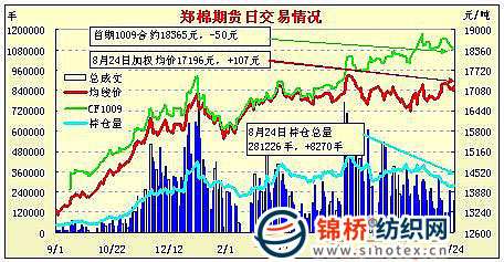 8月24日,鄭棉CF1101合約平開,早盤窄幅震蕩后在多頭買盤推動(dòng)下波段上行,午后在短線平倉盤的壓制下調(diào)整,日線形成陽線,日內(nèi)成交量放大,持倉量增加。CF1101合約日成交118880手,日增倉5952手,終盤持倉量160646手;CF1105合約日成交69346手,日增倉4928手,終盤持倉量84552手。