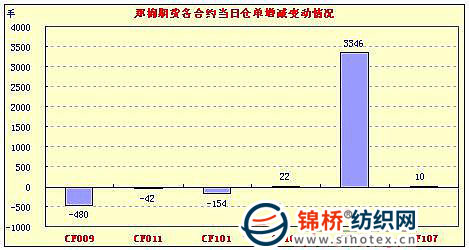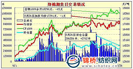 8月26日,鄭棉主要合約高開,盤中寬幅震蕩,尾盤增量迅速拉升,CF1101合約日線形成陽線星,CF1105合約收陽線,日內(nèi)成交量萎縮,遠期合約持倉量增加。CF1101合約日成交77270手,日減倉154手,終盤持倉量163518手;CF1105合約日成交38794手,日增倉3346手,終盤持倉量88864手?;久媲闆r:山西、陜西近兩日受降雨影響,新棉上市再推遲,湖北、湖南、安徽天氣較適宜,新棉陸續(xù)采摘,有企業(yè)零星開秤收購籽棉。籽棉收購價多數(shù)在3.4-4元/斤,成本較高,收購風險較大。大部分棉企繼續(xù)保持觀望,準備9月中旬左右開秤。