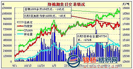 8月3日,鄭棉CF1101合約高開(kāi),早盤在多頭買盤推動(dòng)期價(jià)沖高,隨后在平倉(cāng)盤打壓下回落,盤中低位震蕩,午后多頭買盤再度推動(dòng)期價(jià)上試,尾盤平倉(cāng)盤再涌,期價(jià)隨之下行,日線形成高開(kāi)陽(yáng)線星,日內(nèi)成交量放大,持倉(cāng)量小幅增加。CF1009合約日成交20094手,日減倉(cāng)9272手,終盤持倉(cāng)量38240手;CF1101合約日成交198278手,日增倉(cāng)2670手,終盤持倉(cāng)量194002手。基本面情況:現(xiàn)貨價(jià)格整體維持平穩(wěn),棉商報(bào)價(jià)堅(jiān)挺,出售心態(tài)一般。部分紡織廠庫(kù)存棉花量較大,尤其新疆棉內(nèi)地到貨量不斷增加,某紡織集團(tuán)的新疆棉一天到近15個(gè)車皮,站臺(tái)貨量較大,所以不得不轉(zhuǎn)手出售一部分,市場(chǎng)商業(yè)庫(kù)存再添紡企轉(zhuǎn)賣資源。