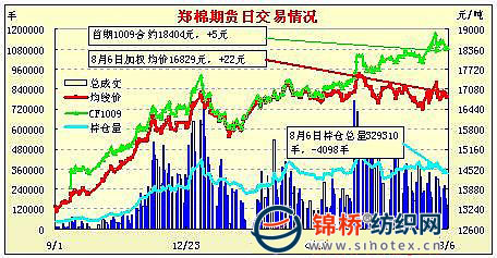 8月6日,鄭棉CF1101合約高開,早盤沖高上試,隨后多頭平倉盤打壓期價調(diào)整,午后空頭回補推動期價回升,日線形成陽線星,日內(nèi)成交量萎縮,持倉量小幅下滑。CF1009合約日成交3220手,日減倉2588手,終盤持倉量26272手;CF1101合約日成交105352手,日減倉1636手,終盤持倉量184630手?;久媲闆r:市場反饋,目前棉花現(xiàn)貨銷售十分困難,并非是紡織廠不用棉花了,主要是拋儲在即紡織企業(yè)不慌不忙,認(rèn)為棉花價格將向下運行。當(dāng)前紡織企業(yè)庫存原料懸殊,小紡廠庫存15天,大紡廠一般在2-3個月甚至有企業(yè)可維持到年底。坊間傳言拋儲起拍價為16500元,但是據(jù)傳一旦有越拍越高超過市場價格的情況出現(xiàn),政府將臨時出臺封頂價預(yù)案,從種種跡象看,政策面態(tài)度是相對認(rèn)可當(dāng)前市場價格的,既不支持過高的價格損害紡織企業(yè)利益,也不支持過低的價格損傷棉農(nóng)利益。