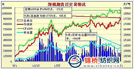 9月1日,鄭棉主要合約小幅低開,盤中大幅震蕩,多空雙方繼續(xù)向遠月移倉,終盤收強,日線形成小陽線,日內成交萎縮,遠期合約持倉量繼續(xù)增加。CF1101合約日成交63220手,日減倉6834手,終盤持倉量140464手;CF1105合約日成交91514手,日增倉5918手,終盤持倉量123184手?;久媲闆r:現(xiàn)貨價格持續(xù)小幅下滑,市場成交一般,紡織企業(yè)仍以儲備棉競拍為主。當前上市籽棉衣分多在36%左右,回潮率在15-16%,收購價較高,棉企遲疑是否開秤。在開秤較早的湖北蔡甸地區(qū)籽棉收購量有所增加,個別企業(yè)半天能收9萬多斤,并預計加工出來有望達到三級。安徽安慶望江也有籽棉零星上市,新疆的吐魯番、哈密也有棉企開始零星收購。
