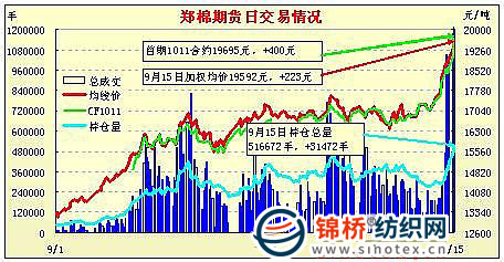 9月15日,紐期上漲再創(chuàng)新高,鄭棉主要合約高開(kāi),早盤(pán)CF1101合約在多頭買(mǎi)盤(pán)推動(dòng)下沖高,隨后在空頭賣盤(pán)與短線平倉(cāng)盤(pán)的打壓下回落盤(pán)整,午后重心下移,CF1101合約日線形成高開(kāi)長(zhǎng)上影線的陽(yáng)線,CF1105合約收陰線星,日內(nèi)成交量與持倉(cāng)量均大幅增加。CF1101合約日成交390434手,日增倉(cāng)10766手,終盤(pán)持倉(cāng)量156824手;CF1105合約日成交1046168手,日增倉(cāng)18650手,終盤(pán)持倉(cāng)量335964手?;久媲闆r:現(xiàn)貨價(jià)格漲幅加大,但成交稀少,市場(chǎng)有價(jià)無(wú)市。新棉上市量仍不大,籽棉收購(gòu)緩慢,大部分企業(yè)仍未開(kāi)秤。并受前幾日天氣影響,棉農(nóng)采摘量較小,軋花廠收購(gòu)難以上量。籽棉收購(gòu)報(bào)價(jià)繼續(xù)走高,普遍在4元/斤左右,最高的在4.2-4.3元/斤,但仍是交售冷清。據(jù)棉企反饋,紡企采購(gòu)增多,不少客戶打電話要貨,但棉企收購(gòu)多未形成批量,無(wú)棉可售。
