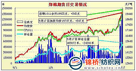 9月17日,周四紐期繼續(xù)上漲,鄭棉主要合約大幅高開,CF1101合約早盤在逢高平倉盤打壓下回落,隨后在空頭回補(bǔ)推動下回穩(wěn)盤整,午后空頭回補(bǔ)買盤持續(xù)推動期價上行,重心隨之上移;CF1105合約早盤增倉盤整,午后在多頭買盤推動下重心上移整理,尾盤在空頭集中回補(bǔ)的支撐下收堅。主要合約日線形成高開陽線,日內(nèi)成交量萎縮,持倉量減少。CF1101合約日成交181872手,日減倉18560手,終盤持倉量133360手;CF1105合約日成交737124手,日減倉6674手,終盤持倉量324244手。基本面情況:新棉開秤地區(qū)增多,籽棉收購價繼續(xù)上調(diào),收購企業(yè)仍多為200型棉企,由于收購價居高,風(fēng)險較大,多數(shù)大型棉企繼續(xù)保持觀望。截止目前加工出的皮棉只能達(dá)到弱三級,少量成交,成交價在18100-18500元/噸左右。部分紡織企業(yè)開始尋買新棉,但三級基本找不到。