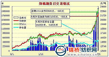 9月29日,鄭棉主要合約低開,盤中在空頭增倉打壓下回落,午后多頭獲利回吐打壓期價迅速下跌,CF1101合約收于跌停,CF1105合約觸及跌停,日線形成長陰線,日內(nèi)成交量萎縮,持倉量減少。CF1101合約日成交159870,日減倉13436手,終盤持倉量106364手;CF1105合約日成交1212430手,日減倉54550手,終盤持倉量325032手?;久媲闆r:北方棉區(qū)天氣好轉(zhuǎn),籽棉水份有所降低,質(zhì)量提高。南部棉區(qū)湖北、安徽持續(xù)陰雨天氣,棉企收購仍難上量。大部分加工出的皮棉仍為四級,市場成交價格穩(wěn)定在在21000-23000元/噸,紡企詢價采購較多。籽棉收購進(jìn)行緩慢,價格繼續(xù)上揚(yáng),受棉籽價格及短絨價格上漲較快影響,棉企收購成本有所降低。籽棉大量上市預(yù)計在十月中下旬。