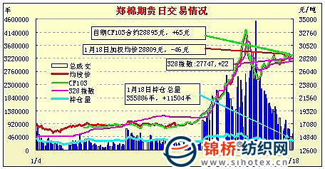 1月18日,鄭棉CF1109合約開盤后上試滑落,午前創(chuàng)日低,午后在空頭回補(bǔ)與多頭買盤的推動下回升,隨后區(qū)間震蕩,終盤收強(qiáng),日線形成小陽線,日內(nèi)成交量變化不大,持倉量小幅增加。CF1105合約日成交12678手,日減倉1982手,終盤持倉量39542手;CF1109合約日成交473206手,日增倉1640手,終盤持倉量234772手。基本面情況:國內(nèi)先后報價穩(wěn)定,市場成交依舊欠佳。由于內(nèi)地棉花質(zhì)量較差,紡織廠對新疆棉的熱度不減,一些手中有新疆棉的內(nèi)地棉商詢價和銷售情況比地產(chǎn)棉要好。另據(jù)反饋,近期棉花價格持續(xù)小幅上漲,籽棉收購價格也隨之上調(diào),棉農(nóng)惜售情緒減弱,個別前期交售情況不好的棉區(qū)現(xiàn)在情況有所好轉(zhuǎn)。紡織市場仍然沒有太大改觀,雖然價格有所反彈,但是下游布廠停滯不前給紗廠帶來不小的壓力,放假停產(chǎn)的情況并沒有改善。