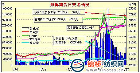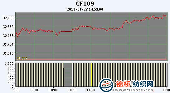 1月27日,鄭棉CF1109合約高開,早盤反復震蕩,多頭買盤與空頭回補支撐期價盤升,午后多頭買盤再涌,推動期價迅速走高,終盤收于日內(nèi)相對高位,日線形成高開陽線,日內(nèi)成交量萎縮,持倉量增加。CF1109合約日成交1012042手,日增倉22206手,終盤持倉量286178手;CF1111合約日成交46760手,日增倉2074手,終盤持倉量55566手。基本面情況:現(xiàn)貨價格大幅上漲,但是紡織廠已陸續(xù)放假,需求階段性下滑,所以盡管現(xiàn)貨棉花報價繼續(xù)上漲但成交清淡。24日三大期貨公司分別出臺春節(jié)前后市場風險防控措施,自1月31日結算時起上調相關期貨合約的漲跌停板幅度和保證金標準,自2月9日結算時起,對未出現(xiàn)單邊市的合約,漲跌停板幅度和保證金標準恢復到調整前水平;預計春節(jié)前期貨價格難有大漲,需注意節(jié)前資金撤離風險。