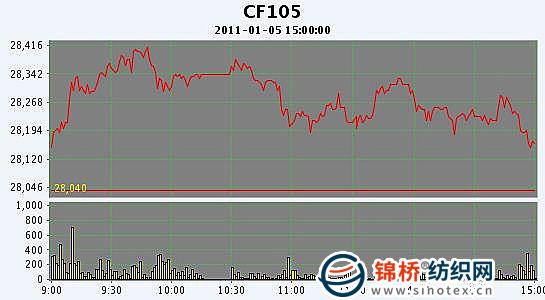 1月5日,鄭棉CF1109合約平開,早盤在多頭買盤推動下上揚,隨后在平倉盤的壓力下震蕩調(diào)整,日線形成1/2上影線的陽線,日內(nèi)成交量放大,持倉量減少。CF1105合約日成交16956手,日減倉1958手,終盤持倉量50186手;CF1109合約日成交685296手,日增倉5162手,終盤持倉量222426手。