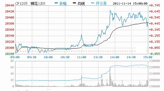 11月14日,鄭棉CF1205合約微幅高開,盤中橫向整理,午后多頭買盤推動期價沖高盤整,日線形成高開陽線,日內(nèi)成交量放大,持倉量大幅增加。CF1201合約日成交3050手,日減倉1410手,終盤持倉量26994手;CF1205合約日成交109478手,日增倉22422手,終盤持倉量221144手?;久媲闆r:國內(nèi)棉花現(xiàn)貨市場整體成交量比較清淡,高等級棉出貨情況良好,價格相對比較穩(wěn)定,而低等級棉銷售量少。當(dāng)前紡織企業(yè)庫存量比較少,采購積極性有所提升,但是采購價格依舊壓的比較低,因此棉企送貨并不積極,雙方繼續(xù)處于僵持狀態(tài)中。另外,當(dāng)前各地籽棉收購價格比較混亂,絕大多數(shù)棉農(nóng)不愿接受4元/斤以下的籽棉價格,因此惜售心態(tài)比較濃厚。而軋花廠方面,皮棉銷售情況一般,價格也提不上來,為了盡快能夠交儲,適當(dāng)提價收購。