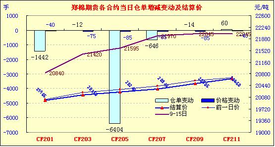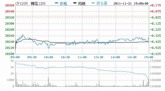 11月21日,鄭棉CF1205合約低開,早盤反彈后在平倉盤壓制下走低,午后空頭回補(bǔ)支撐期價(jià)小幅回升,日線形成低開小陽線,日內(nèi)成交量變化不大,持倉量減少。CF1201合約日成交2388手,日減倉1442手,終盤持倉量20946手;CF1205合約日成交46102手,日減倉6404手,終盤持倉量185822手?;久媲闆r:受到內(nèi)地棉區(qū)大范圍降雨的影響,籽棉交售緩慢,個(gè)別地區(qū)交售基本停滯,而皮棉購銷也也陷入僵持。在政策托底的支撐下,400型企業(yè)交儲(chǔ)依然積極,待天氣轉(zhuǎn)晴之后將繼續(xù)加大力度收購籽棉,但對籽棉質(zhì)量要求較高;200型企業(yè)只能望棉興嘆,無奈退市觀望。由于紡織行業(yè)整體不景氣,棉紗價(jià)格連續(xù)下挫,廠商出貨緩慢,限產(chǎn)、停產(chǎn)現(xiàn)象逐漸增多,紡企的日子越來越難過。棉副方面各產(chǎn)品普遍企穩(wěn),棉籽日均繼續(xù)以0.99元/斤的價(jià)格穩(wěn)定結(jié)束本周。