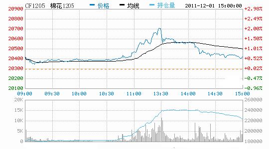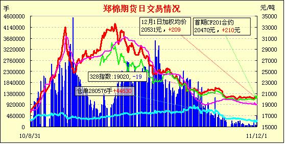 12月1日,在昨日晚間央行調(diào)準(zhǔn)以及美聯(lián)儲聯(lián)合6大央行救市,重大利好刺激下,外盤大多收漲,鄭棉早盤高開震蕩,臨近11點(diǎn)左右出現(xiàn)強(qiáng)勢拉升,放量巨幅增倉,截止中午收盤,鄭棉1205合約報收于20710元/噸,上漲415元/噸,漲幅2.04%,交易量約21.7萬手,增倉63760手。