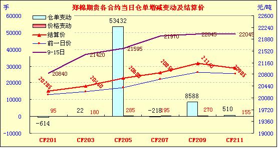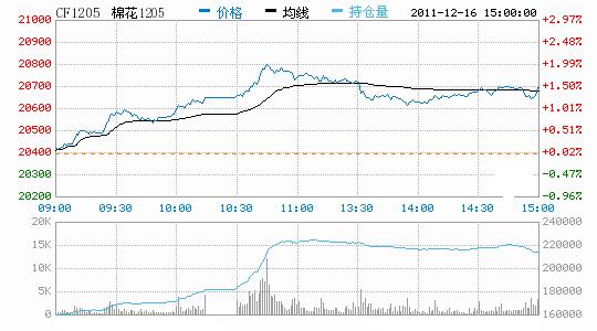 12月16日,鄭棉期貨因昨日財(cái)政部公布棉花進(jìn)口新滑準(zhǔn)稅標(biāo)準(zhǔn)和機(jī)構(gòu)預(yù)計(jì)明年棉花種植面積下滑,市場出現(xiàn)中幅反彈。至收盤,鄭期棉指數(shù)漲293點(diǎn)收于20777,總成交大幅增加至38.3萬手,總持倉大增6.2手至28.1萬手。主力1205漲300點(diǎn)收于20695,成交大幅增至32.3萬手,持倉大增5.3手至21.4萬手。受美國經(jīng)濟(jì)數(shù)據(jù)利好推動(dòng), 紐約期棉主力3月合昨夜?jié)q1.17美分至86.29美分。今日進(jìn)口棉M指數(shù)漲0.61美分至99.64美分,折滑準(zhǔn)稅價(jià)至16609,與內(nèi)棉價(jià)差擴(kuò)大至-2458元/噸。今日國內(nèi)棉價(jià)328B指數(shù)小漲2點(diǎn)至19067。新棉收購接近尾聲,棉企交儲(chǔ)為主,紡企采購價(jià)小幅上調(diào)。收儲(chǔ)方面,截止15日,2011年度棉花臨時(shí)收儲(chǔ)累計(jì)成交157.59萬噸,占全國棉花預(yù)計(jì)消費(fèi)總量的15.75%。紗線價(jià)格方面,今日 KC32S、JC40S價(jià)格未變化,分別為25500、30750。市場成交一般。今日撮合市場反彈為主,其中MA1205漲120至20340,與鄭期棉1205價(jià)差至-355。從今日棉市強(qiáng)勁反彈勢頭看,盡管不能斷言市場逆轉(zhuǎn),但后市反彈可期,22000點(diǎn)位可望達(dá)成。
