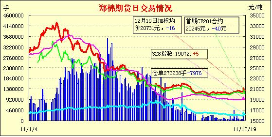 12月19日,鄭棉主要合約低開,近期合約在多頭平倉打壓下盤跌,遠(yuǎn)期合約受到空頭賣盤打壓下滑,日線形成低開小陰線,日內(nèi)成交量萎縮,持倉量近減遠(yuǎn)增。CF1205合約日線形成低開陰線星,CF1209合約形成低開陽線,日成交量放大,持倉量近減遠(yuǎn)增。CF1205合約日成交86776手,日減倉10424手,終盤持倉量204078手;CF1209合約日成交23522手,日增倉2768手,終盤持倉量48232手?;久媲闆r:近幾日山東省德州地區(qū)籽棉收購價格略漲,皮棉價格趨穩(wěn),棉農(nóng)惜售心理略有松動,交售量有所增加。12月19日,武城縣四級籽棉收購價3.85元/斤上下(衣分38%,回潮率12%),比上周上漲0.05元/斤左右。棉籽價格0.99元/斤左右,比上周上調(diào)0.08元/斤左右。當(dāng)?shù)仄っ掬N售依然遲緩,價格較為穩(wěn)定,正三級公檢大包棉19500元/噸(提貨、毛重、帶票,下同),正四級公檢大包棉18400元/噸。近半月來,當(dāng)?shù)丶唭r止跌趨穩(wěn),C32S棉紗主流成交價在26000元/噸左右,但棉紗銷售沒有明顯改觀,庫存量較大。隨著元旦、春節(jié)臨近,棉農(nóng)惜售心理有所松動,當(dāng)?shù)亟皇鄣霓r(nóng)民逐漸增多。近幾日天氣晴好,武城縣棉企收購數(shù)量尚可,日收購量10-20萬斤,但品級較前期有所下降。當(dāng)前棉企以交國儲為主。
