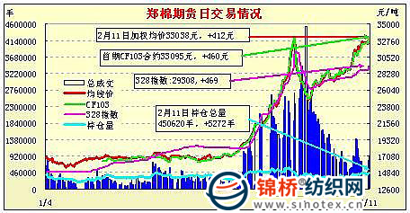 2月11日,鄭棉CF1109合約高開,早盤在多頭買盤推動(dòng)下增倉上行創(chuàng)日高,盤中高位成交量放大,隨后在空頭賣盤與多頭平倉壓制下回落,午后多頭平倉盤再涌,期價(jià)迅速下滑收于日內(nèi)低位,日線形成高開1/1上影線的小陰線,日內(nèi)成交量放大,持倉量微增。CF1109合約日成交643398手,日增倉4978手,終盤持倉量261476手;CF1111合約日成交52988手,日減倉4114手,終盤持倉量50878手。基本面情況:節(jié)后一部分紡織廠和小布廠開機(jī),買棉花的紡織廠比較多,但是成交寥寥無幾,主要是棉商和軋花廠惜售情緒較濃。受國際農(nóng)產(chǎn)品大幅上漲影響,節(jié)后國內(nèi)棉花電子盤延續(xù)漲勢,目前電子盤上棉花價(jià)格與現(xiàn)貨價(jià)格不斷拉大,增加市場利多氣氛。