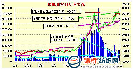 2月16日,鄭棉CF1109合約平開(kāi),早盤(pán)反復(fù)震蕩調(diào)整,隨后多頭集中買(mǎi)盤(pán)推動(dòng)期價(jià)沖高,午后短線平倉(cāng)盤(pán)壓制期價(jià)下滑,尾盤(pán)在空頭集中回補(bǔ)的支撐下回升,日線形成小陽(yáng)線,日內(nèi)成交量溫和放大,持倉(cāng)量繼續(xù)增加。CF1109合約日成交878440手,日增倉(cāng)20340手,終盤(pán)持倉(cāng)量283216手;CF1111合約日成交43672手,日增倉(cāng)1240手,終盤(pán)持倉(cāng)量51982手?;久媲闆r:現(xiàn)貨市場(chǎng)上價(jià)格波動(dòng)不大,成交也一般。市場(chǎng)上反映高等級(jí)棉稀少,而進(jìn)口棉到港后與內(nèi)地面差價(jià)太高,所以紡織廠采購(gòu)并不如意,棉花企業(yè)對(duì)于后市看法增多,一部分繼續(xù)看漲信心較強(qiáng),一部分害怕棉花的大漲將迎來(lái)國(guó)家的宏觀調(diào)控,但又不舍得賣(mài)左右搖擺不定。紡織市場(chǎng)紗線銷(xiāo)售平平,但是據(jù)信息員反饋都在忙著招工。國(guó)際市場(chǎng)上越南貨幣貶值,對(duì)中國(guó)的訂單或會(huì)有些影響,令下游經(jīng)銷(xiāo)商較為擔(dān)心。