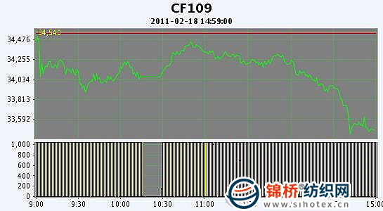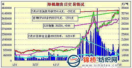 2月18日,鄭棉CF1109合約高開,早盤在空頭賣盤打壓下回落,午前一度增倉回升,午后受到多頭平倉與空頭賣盤打壓收低,日線形成高開陰線,日內(nèi)成交量溫和放大,持倉少量增加。CF1109合約日成交1183804手,日增倉1262手,終盤持倉量291316手;CF1111合約日成交35124手,日減倉3112手,終盤持倉量49698手?;久媲闆r:國內(nèi)現(xiàn)貨價格繼續(xù)上漲,但成交有價無市,一方面棉商大多不愿出售,即使想要出售報價也較高,另一方面紡織廠在猶豫到底要不要采購棉花。受到棉花價格上漲影響,棉紗銷售放量上漲,尤其是32S和40S需求較大。