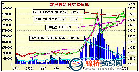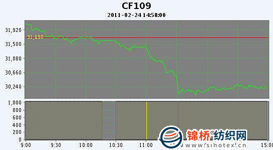 2月24日,鄭棉CF1109合約小幅高開,盤中在空頭賣盤打壓下走低,午間期價加速下行測試3萬元關(guān)口后受到短線回補(bǔ)盤支撐反彈,日線形成高開長陰線,日內(nèi)成交量放大,持倉量增加。CF1109合約日成交1597824手,日增倉17016手,終盤持倉量302352手;CF1111合約日成交50442手,日減倉7656手,終盤持倉量38098手。基本面情況:現(xiàn)貨報價開始松動,內(nèi)地棉價下跌500元/噸左右,但是新疆棉報價堅挺,暫時未動。值得關(guān)注的是下游紗線市場看似很好,但是由于成本上升,加上紡廠之間互相打價格戰(zhàn),利潤空間并不大。