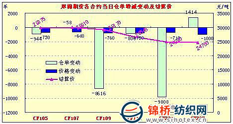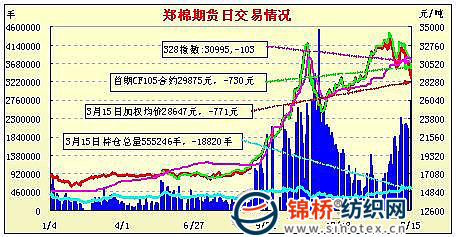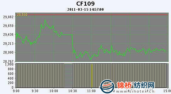 3月15日,鄭棉CF1109合約平開,早盤調(diào)整后反抽沖高,盤中高位換手后大幅跳水,午后窄幅震蕩,交投重心下移,日線形成陰線,日內(nèi)成交量變化不大,持倉量小幅下滑。CF1109合約日成交2315796手,日減倉8616手,終盤持倉量380478手;CF1111合約日成交16894手,日減倉808手,終盤持倉量36836手。基本面情況:棉花現(xiàn)貨報(bào)價(jià)繼續(xù)下調(diào),周末山東魏橋紡織下調(diào)4級(jí)棉采購價(jià)100元。日本遭受強(qiáng)烈地震海嘯,短期內(nèi)將對(duì)大宗商品價(jià)格利空,今日國(guó)內(nèi)兩個(gè)電子盤大幅下探,鄭棉主力合約cf1109開盤30950元/噸,午盤收?qǐng)?bào)29690元,跌破三萬。現(xiàn)貨市場(chǎng)擔(dān)憂情緒開始蔓延,軋花廠和棉商出貨進(jìn)一步加快,落袋為安心理增強(qiáng)。棉紗價(jià)格繼續(xù)下跌,紡織廠情緒不佳采購力度減弱。