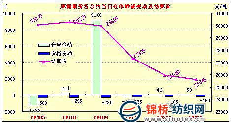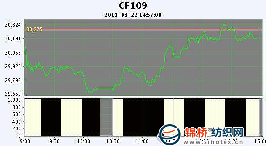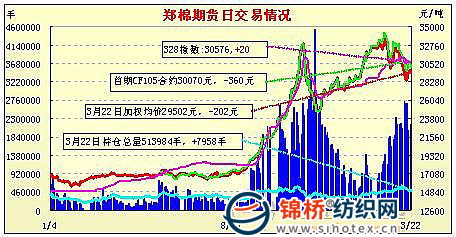 3月22日,鄭棉CF1109合約低開,早盤受空頭打壓下滑創(chuàng)日低,隨后多頭買盤與空頭回補推動期價脫離低點快速回升,午后高位震蕩,尾盤在多頭平倉壓制下調整,日線形成陽線星,日內成交量變化不大,持倉量增加。CF1109合約日成交1781604手,日增倉9180手,終盤持倉量355856手;CF1111合約日成交6834手,日減倉240手,終盤持倉量34622手?;久媲闆r:市場上之前信心滿滿看漲后市的心態(tài)有所減少,要求落袋為安的心態(tài)增多,對于后市的分歧也逐漸拉大。現(xiàn)貨報價可商量的余地多了,但是低于成本貿易商是不會出手的。上周末國內方面央行年內第三次提高存款準備金率0.5個百分點至歷史高位20%,國際方面中東局勢加劇,市場不確定因素增加。