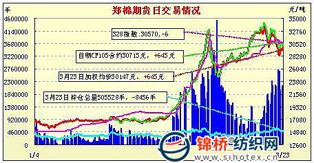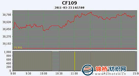 3月23日,鄭棉CF1109合約高開,早盤反復(fù)震蕩,午間在空頭回補(bǔ)推動(dòng)下沖高,午后高位震蕩,日線形成高開陽線,日內(nèi)成交量萎縮,持倉量增加。CF1109合約日成交1479724手,日減倉2242手,終盤持倉量353614手;CF1111合約日成交6686手,日增倉398手,終盤持倉量35020手?;久媲闆r:現(xiàn)貨報(bào)價(jià)企穩(wěn),市場(chǎng)成交依舊不旺,棉企方面雖然有落袋為安的心理,但跌出他們的心理價(jià)格是不可能出手的,棉紗價(jià)格繼續(xù)疲軟,紡織廠購買消極,隨用隨買。據(jù)駐地信息員反饋,山東魏橋紡織下調(diào)其皮棉采購價(jià)后,前來交貨的企業(yè)寥寥,畢竟低價(jià)格采購難度加大。電子盤持續(xù)盤整,現(xiàn)貨成交處于拉鋸狀態(tài),市場(chǎng)氣氛不佳。