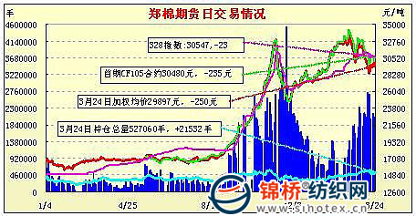 3月25日,鄭棉CF1109合約小幅高開,早盤在空頭打壓下下行,盤中受到短線多頭支撐反抽后再度下落,午間創(chuàng)日低,午后一度反彈,但是尾盤受到多頭集中平倉的壓制迅速跳水,日線形成高開小陰線,日內(nèi)成交量變化不大,持倉量減少。CF1109合約日成交1453562手,日減倉14920手,終盤持倉量357976手;CF1111合約日成交8476手,日減倉1674手,終盤持倉量32738手?;久媲闆r:棉花銷售不暢,下游市場遲遲打不開,對(duì)上游銷售壓力越積越大。近期外棉市場比國內(nèi)市場熱鬧的多,大棉商回購棉花,在高價(jià)轉(zhuǎn)銷到東南亞的其他國家。企業(yè)心態(tài)很糾結(jié),一些“頑固派”的貿(mào)易商堅(jiān)持供需缺口問題繼續(xù)看漲,但是大多數(shù)的貿(mào)易商開始轉(zhuǎn)為“行動(dòng)派”,積極主動(dòng)銷售手中棉花,值得注意的是他們積極銷售的多是手中低等級(jí)棉花,對(duì)高等級(jí)的囤積現(xiàn)象仍然存在。
