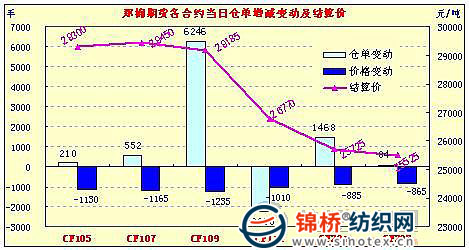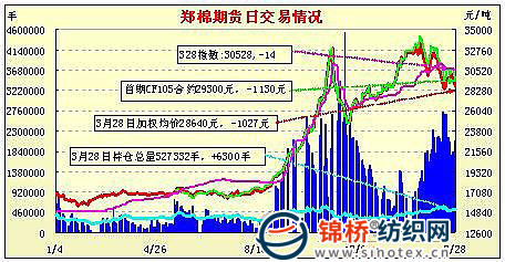 3月28日,鄭棉CF1109合約小幅低開,早盤在空頭賣盤打壓下一路走低,午后加速下滑創(chuàng)日低,隨后空頭短線回補盤支撐期價反彈,日線形成低開陰線,日內(nèi)成交量放大,持倉量小幅增加。CF1109合約日成交1725512手,日增倉6246手,終盤持倉量364222手;CF1111合約日成交9610手,日減倉2260手,終盤持倉量30478手。基本面情況:紡織廠情況仍不見好轉(zhuǎn),大部分企業(yè)是接了單再去采購棉花,個別紡企在即使皮棉庫存為零但沒有訂單的情況下,也不急于補充皮棉庫存,采購態(tài)度消極;近兩日人民幣波動頻繁再次創(chuàng)出新高,這也引起了紡織廠的擔憂。棉花企業(yè)報價繼續(xù)下調(diào),多為低等級棉,高等級棉仍報價堅挺;棉花貿(mào)易商對于后市看漲的心態(tài)進一步松動,棉商雖出貨意愿不減,無奈紡企不愿接手,現(xiàn)貨成交遭遇春寒。