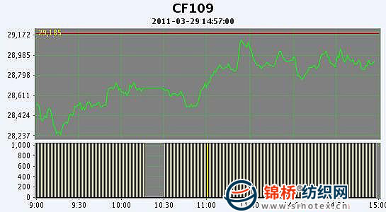 3月29日,鄭棉CF1109合約小幅低開,早盤慣性調(diào)整后在多頭買盤支撐下走高,午間創(chuàng)日高,午后在短線平倉盤的壓力下調(diào)整橫向整理,交投重心較午前明顯上移,日線形成低開陽線,日內(nèi)成交量放大,持倉量增加。CF1109合約日成交2140438手,日增倉12638手,終盤持倉量376860手;CF1111合約日成交8898手,日減倉222手,終盤持倉量30256手?;久媲闆r:目前春播工作正由南向北陸續(xù)展開,河北地區(qū)植棉意向增加較大,另今年農(nóng)資產(chǎn)品從種子到化肥到農(nóng)藥均普遍上漲10-20%。雖然物化成本增加,但由于對今年籽棉價(jià)格信心較大,棉農(nóng)種棉積極性仍然較好。