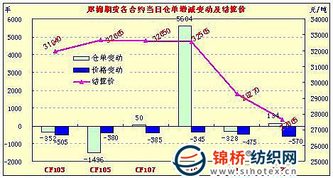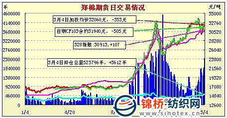 3月4日,鄭棉CF1109合約小幅高開(kāi),午前震蕩沖高,隨后在高位空頭賣(mài)盤(pán)的打壓下下滑觸及日低,午后反彈脫離低點(diǎn)后震蕩盤(pán)升,尾盤(pán)受到多頭集中平倉(cāng)盤(pán)的打壓回落,日線形成小陰線,日內(nèi)成交量維持在較高的水平,持倉(cāng)少量增加。CF1109合約日成交1913172手,日增倉(cāng)5604手,終盤(pán)持倉(cāng)量347450手;CF1111合約日成交26376手,日減倉(cāng)328手,終盤(pán)持倉(cāng)量41258手?;久媲闆r:現(xiàn)貨價(jià)格變化不大,市場(chǎng)行情依舊是棉商出貨意愿偏低,紡織廠謹(jǐn)慎采購(gòu),市場(chǎng)成交比較冷清。紗廠庫(kù)存壓力比較大,下游企業(yè)反映棉紗價(jià)格上漲過(guò)快,采購(gòu)也不積極。另?yè)?jù)信息員反饋,雖然棉商出貨意愿較低,但是軋花廠出貨意愿較好,主要是因?yàn)殡娮颖P(pán)波動(dòng)較大,很多企業(yè)不愿意再等,均表示愿意“落袋為安”。