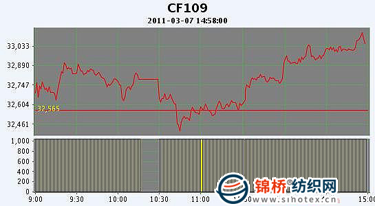 3月7日,鄭棉CF1109合約小幅高開,午前反抽后震蕩下滑,盤中低位大量換手,午后在空頭回補(bǔ)與多頭買盤的推動(dòng)下?lián)P升,日線形成小陽線,日內(nèi)成交量萎縮,持倉量增加。CF1109合約日成交155690手,日增倉19050手,終盤持倉量366500手;CF1111合約日成交26464手,日增倉3414手,終盤持倉量44672手。 基本面情況:現(xiàn)貨報(bào)價(jià)小幅上揚(yáng),市場(chǎng)上新疆棉現(xiàn)貨實(shí)際成交價(jià)格32500-33500元/噸,成交情況較好。近兩日電子盤圍繞著32000元震蕩,政策上不支持棉價(jià)過于上行也或多或少地影響著投資者的交易行為。另據(jù)信息員反饋現(xiàn)貨上真正好的棉花還是比較難買,不是以次充好就是漫天要價(jià),近日滌綸銷售較好,主要是滌棉差價(jià)較大導(dǎo)致。