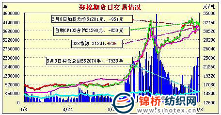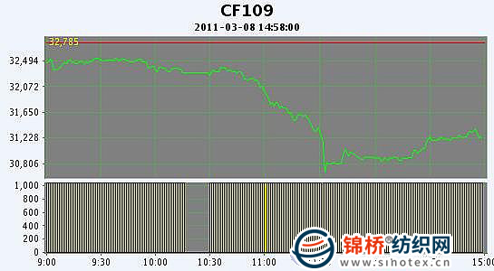 3月8日,鄭棉CF1109合約低開,午前反復(fù)震蕩后下滑,盤中低位大量換手,午間在空頭賣盤打壓下迅速跳水,午后創(chuàng)日低,盤中低位增量換手后反抽,日線形成1/3下影線的陰線,日內(nèi)成交量放大,持倉量微增。CF1109合約日成交1891186手,日增倉5412手,終盤持倉量371912手;CF1111合約日成交30060手,日減倉3024手,終盤持倉量41648手?;久媲闆r:現(xiàn)貨報(bào)價(jià)穩(wěn)中小幅上揚(yáng),市場上成交量依舊不大,下游紗廠庫存壓力較大,采購也不積極,市場上除了新疆棉銷售較好外,地產(chǎn)成交的多是弱4級(jí)的棉花。市場上大棉商繼續(xù)囤貨看漲,而小型的棉企銷售積極性則較高,售空存棉兌現(xiàn)保障較為理想的利潤成為不少棉企的首選策略。