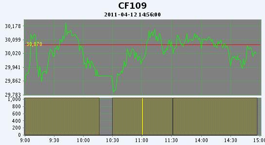 4月12日,鄭棉CF1109合約小幅低開(kāi),盤(pán)中反復(fù)震蕩并伴隨大量增倉(cāng),午后重心抬高,尾盤(pán)受到短線平倉(cāng)盤(pán)壓力下滑,日線形成陽(yáng)線星,日內(nèi)成交量變化不大,持倉(cāng)量大幅增加。CF1109合約日成交1736266手,日增倉(cāng)19828手,終盤(pán)持倉(cāng)量425852手;CF1111合約日成交343198手,日增倉(cāng)10806手,終盤(pán)持倉(cāng)量140250手?;久媲闆r:棉花現(xiàn)貨市場(chǎng)急于出售的情緒繼續(xù)蔓延,現(xiàn)貨價(jià)格持續(xù)下降,囤棉恐慌心態(tài)加重?,F(xiàn)貨價(jià)格一直在下跌,但是紡企沒(méi)有明顯的補(bǔ)庫(kù)活動(dòng),成交十分清淡。今日部分廠又下調(diào)了期棉紗價(jià)格,中小紡織廠資金壓力太大,賠本出售,下游織造廠用多少進(jìn)多少,庫(kù)存增加不大。另?yè)?jù)信息員反饋,紡織替代產(chǎn)品比例增加,一些企業(yè)吃不準(zhǔn)后市,停掉了一些半成品如半精梳及精梳棉網(wǎng)。