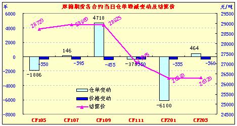 4月14日,鄭棉CF1109合約低開,早盤震蕩后在空頭賣盤壓制下走低,盤中橫向盤整,午后繼續(xù)增倉(cāng)下行,日線形成低開陰線,日內(nèi)成交量放大,持倉(cāng)量變化不大。CF1109合約日成交2133070手,日增倉(cāng)4718手,終盤持倉(cāng)量400574手;CF1111合約日成交275522手,日減倉(cāng)6100手,終盤持倉(cāng)量125104手。基本面情況:現(xiàn)貨報(bào)價(jià)繼續(xù)下調(diào),部分地區(qū)報(bào)價(jià)雖保持穩(wěn)定,但是成交幾無(wú)。部分小型紡織企業(yè)由于經(jīng)營(yíng)壓力大,停產(chǎn)現(xiàn)象繼續(xù)擴(kuò)大;開機(jī)的紡織廠替代性明顯,純棉紗的銷售依舊不樂(lè)觀,企業(yè)在低迷中繼續(xù)等待行業(yè)的好轉(zhuǎn)。各地春播工作陸續(xù)展開,由于近兩天全國(guó)氣溫回升明顯,新疆地區(qū)播種速度加快,據(jù)天氣預(yù)報(bào)顯示未來(lái)十天新疆地區(qū)天氣有利于棉花播種;全國(guó)其他直播棉區(qū)或是制缽棉區(qū)播種也陸續(xù)展開。