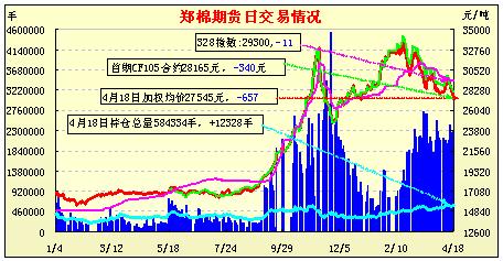 4月18日,鄭棉CF1109合約低開,早盤下探盤整,午間在短線多頭買盤推動下沖高,午后受到平倉盤壓制回落,尾盤在空頭回補(bǔ)支撐下反抽,日線形成1/2下影線的陽線,日內(nèi)成交量保持較高的水平,持倉量小幅增加。CF1109合約日成交1947800手,日增倉9044手,終盤持倉量404086手;CF1201合約日成交335010手,日增倉6242手,終盤持倉量131800手?;久媲闆r:國內(nèi)現(xiàn)貨仍然難以動銷,現(xiàn)貨商開始害怕,積極聯(lián)系下游尋求落袋為安。紡織廠雖然知道自己的庫存在新花上市前是偏緊的,但是在市場陷入利空氣氛的情況下還是觀望為主。據(jù)反饋,湖南常德、岳陽、益陽、長沙等地紡織廠生產(chǎn)情況慘淡,一些大廠為了搶奪訂單,不惜血本降價。
